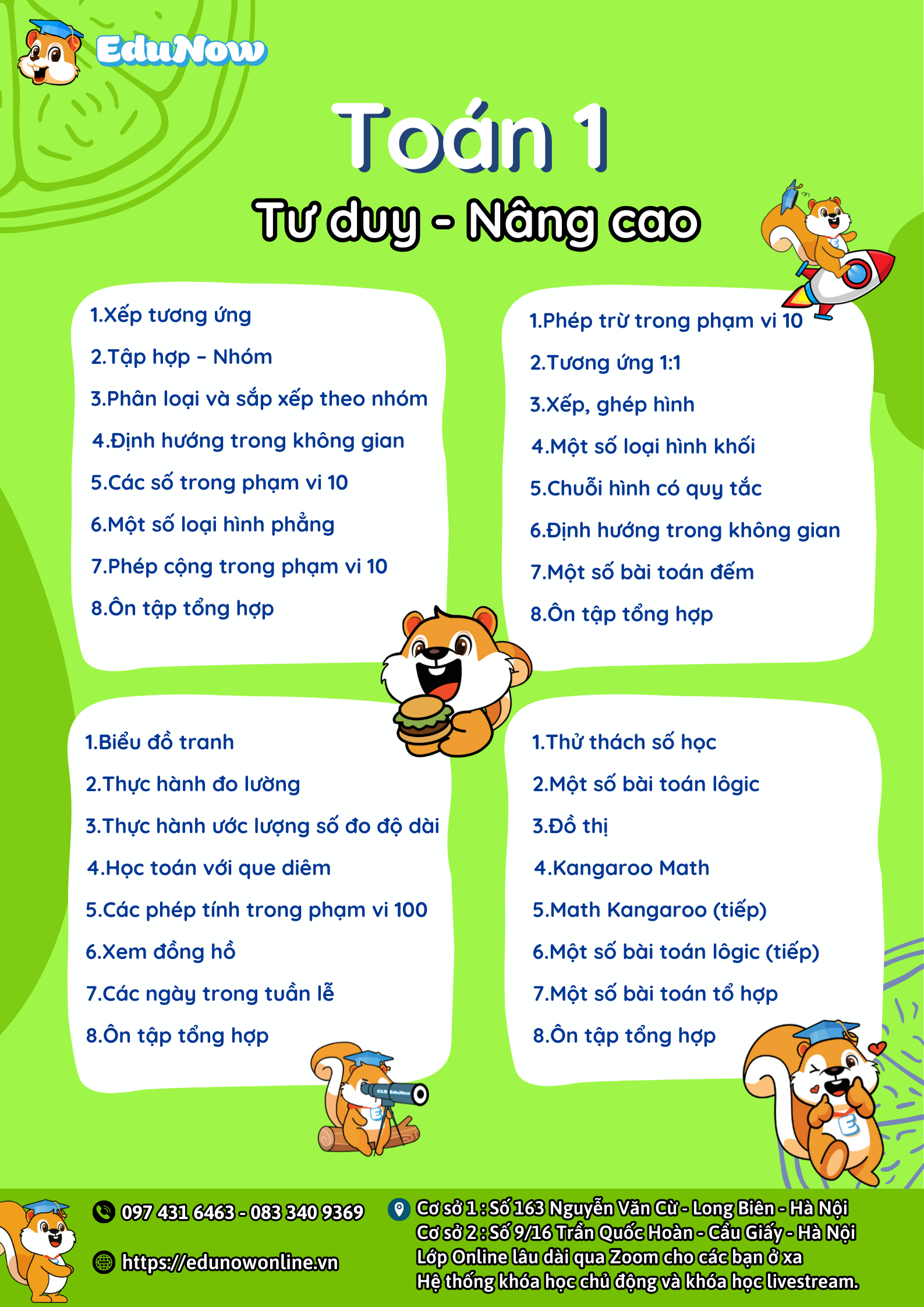 Chương trình Nâng cao Tư duy Toán lớp 1 của EduNow là bước tiếp theo giúp các em phát triển tư duy, khám phá Toán học qua những hoạt động thú vị và thử thách hấp dẫn. Nội dung chương trình đa dạng với nhiều chủ đề như: