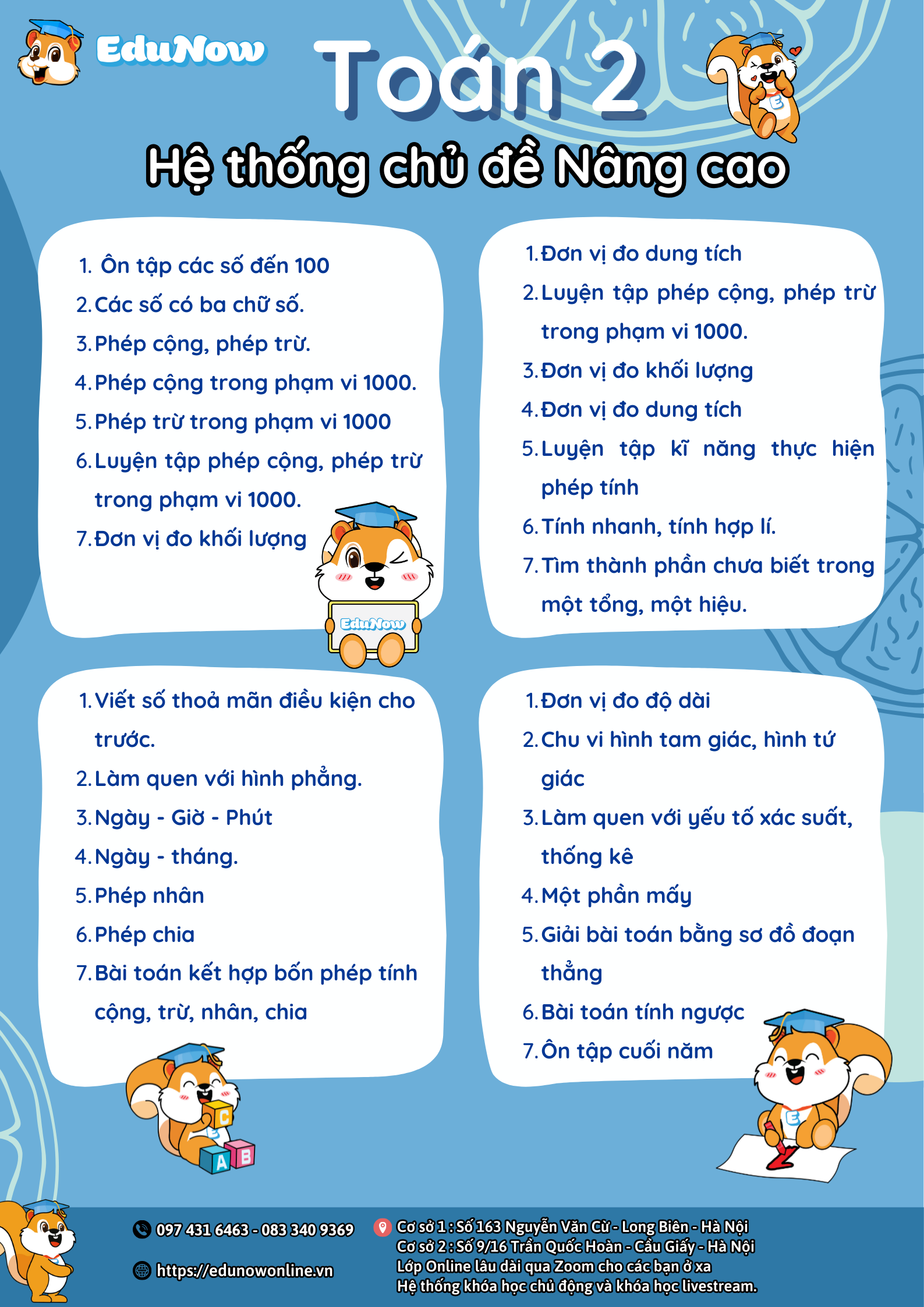 Chương trình Toán 2 – Nâng cao của EduNow là bước tiếp nối chương trình cơ bản, giúp các em học sinh lớp 2 củng cố kiến thức nền tảng, đồng thời mở rộng và phát triển kỹ năng tư duy Toán học ở mức cao hơn. Chương trình gồm nhiều chủ đề phong phú:
