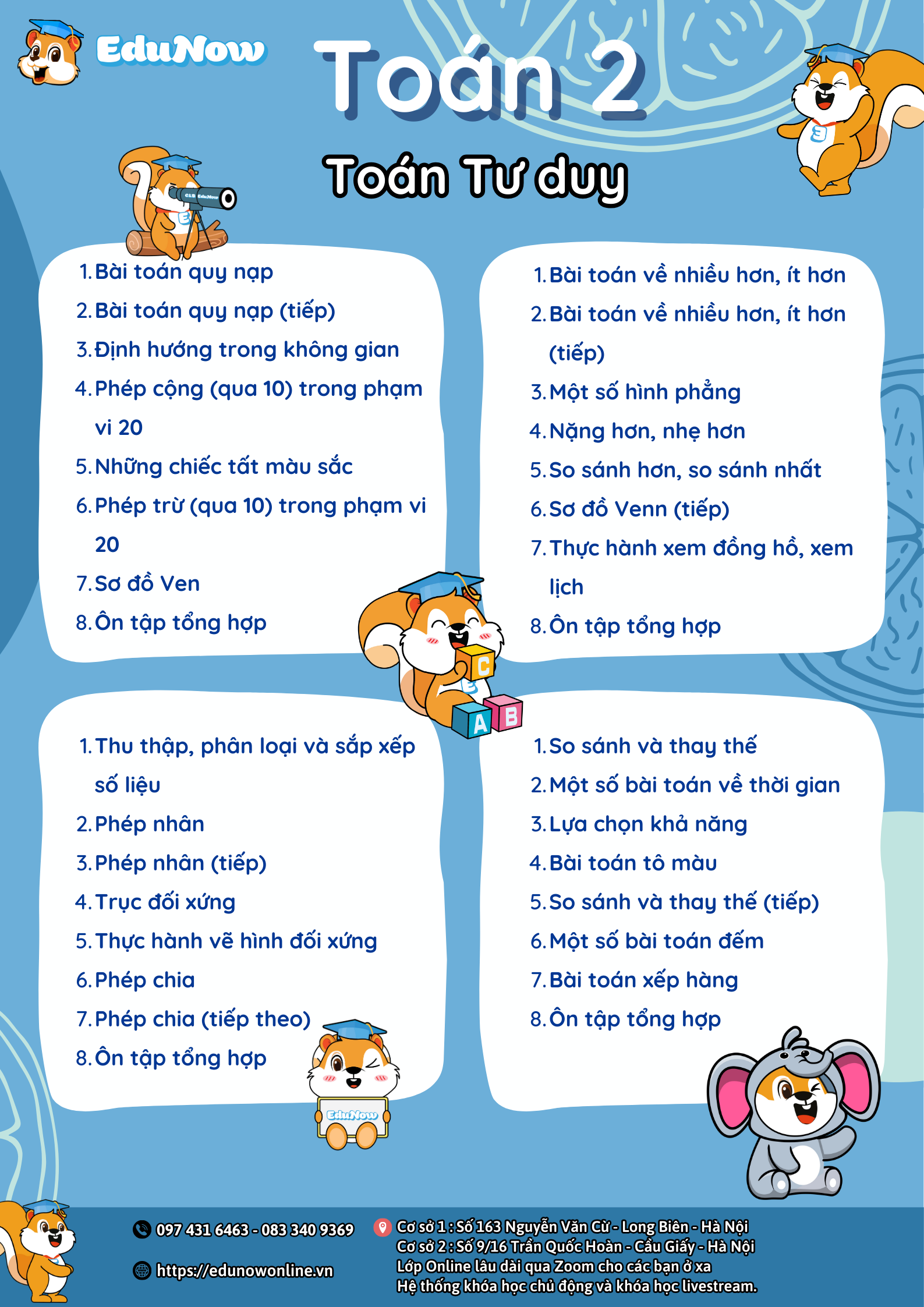 Chương trình Toán 2 – Toán Tư duy của EduNow được thiết kế nhằm phát triển khả năng suy luận logic, kỹ năng phân tích và giải quyết vấn đề, đồng thời chuẩn bị cho các em bước vào các kỳ thi Toán học trong nước và quốc tế. Chương trình gồm nhiều chủ đề phong phú: